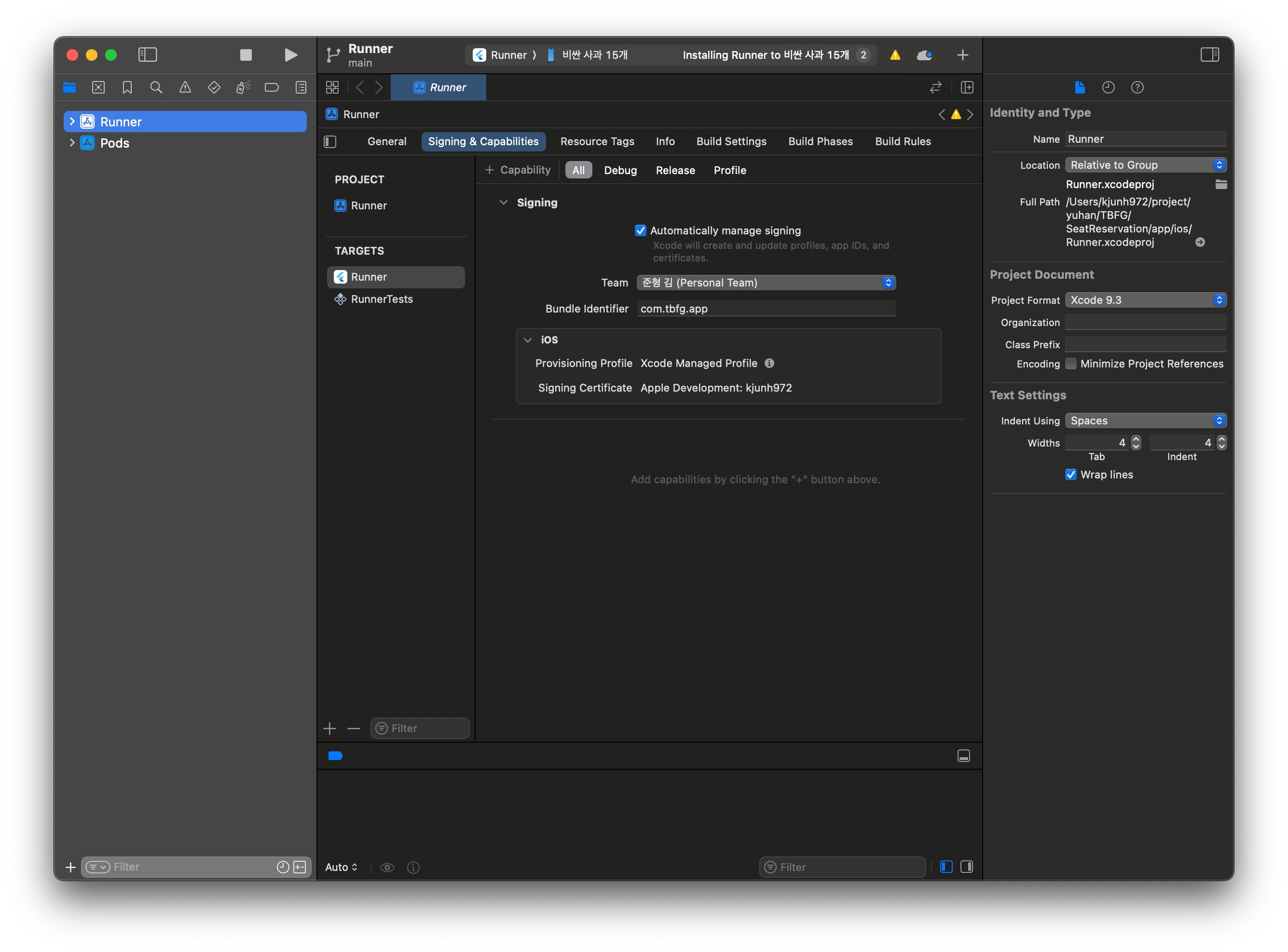 먼저 Team 칸에서 애플 계정을 로그인 한 후에 Bundle Identifier 에서 프로젝트 도메인 명을 입력합니다.