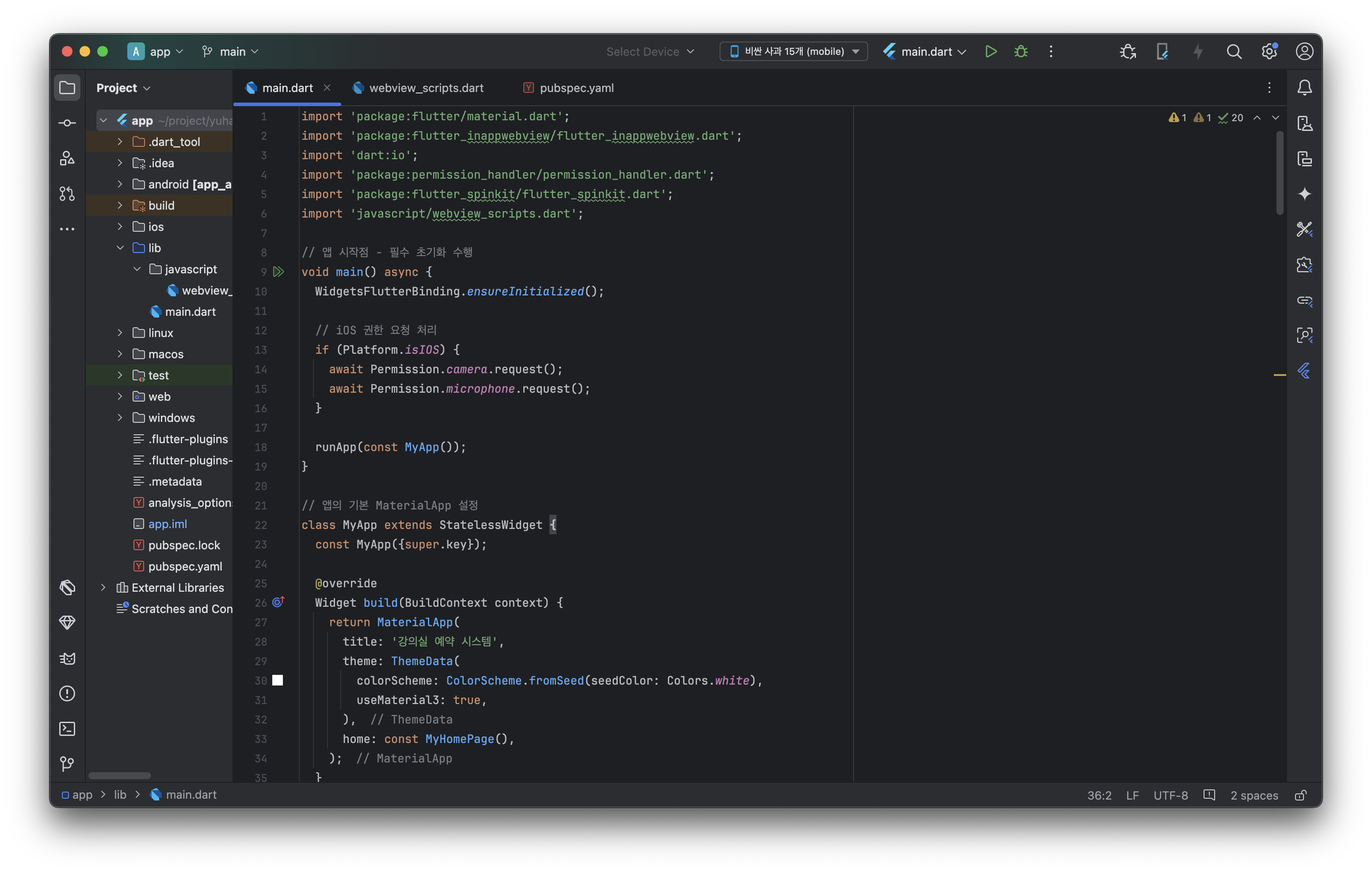 저번 글에는 flutter를 활용해 Spring Boot 서버 화면을 웹뷰로 띄우기 위해 이것저것 설정을 해보았고 이번엔 프로젝트를 생성해 웹뷰를 만들고 실행까지 해보겠습니다.