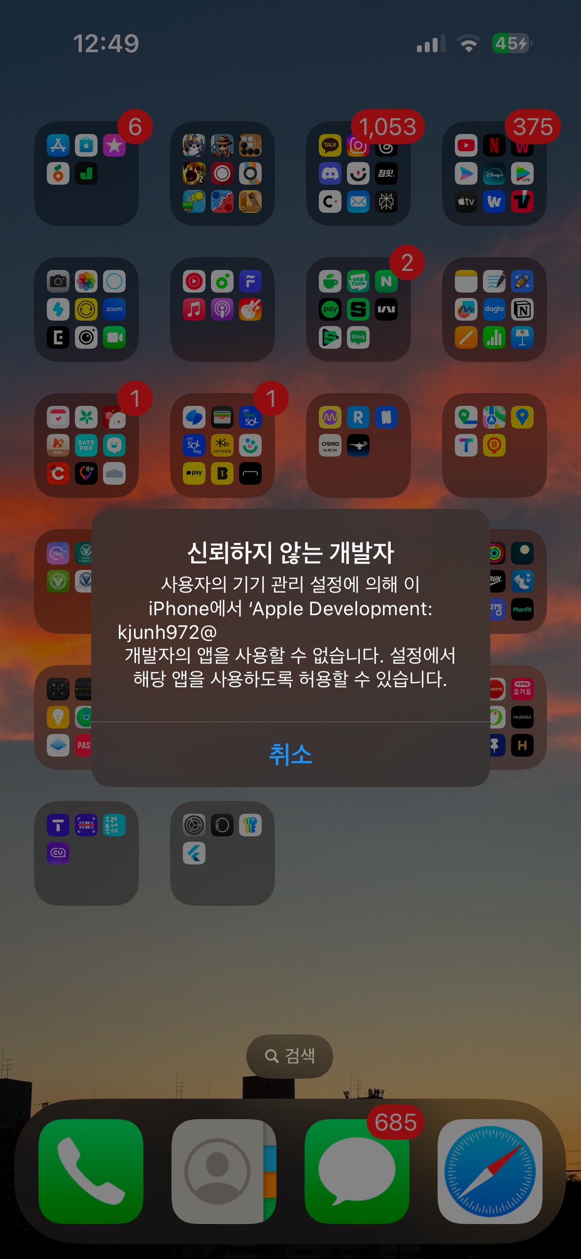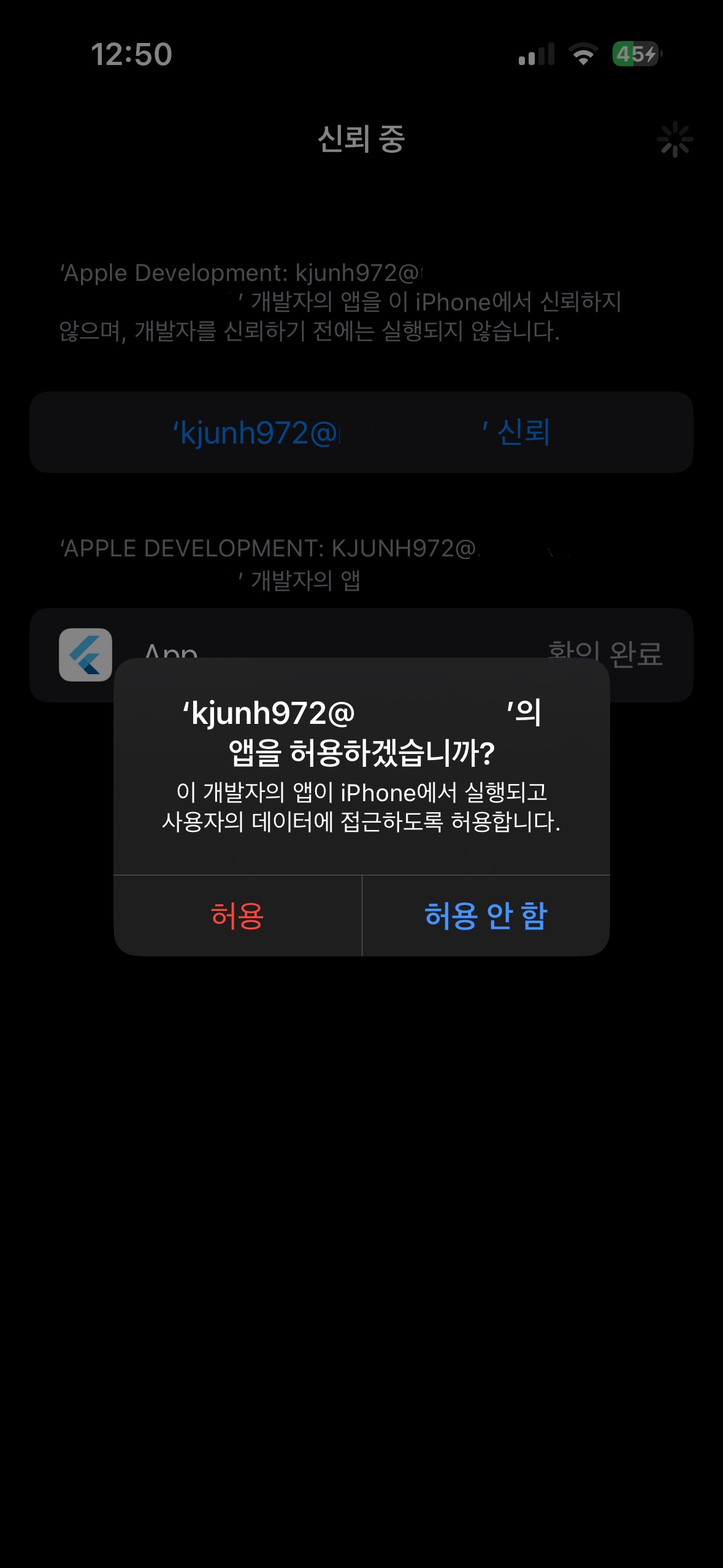 XCode를 통해 빌드까지 성공했다면 핸드폰에서 신뢰하지 않는 개발자 승인을 해야 Flutter로 프로젝트 실행할 때 핸드폰에서 앱이 정상적으로 실행합니다.