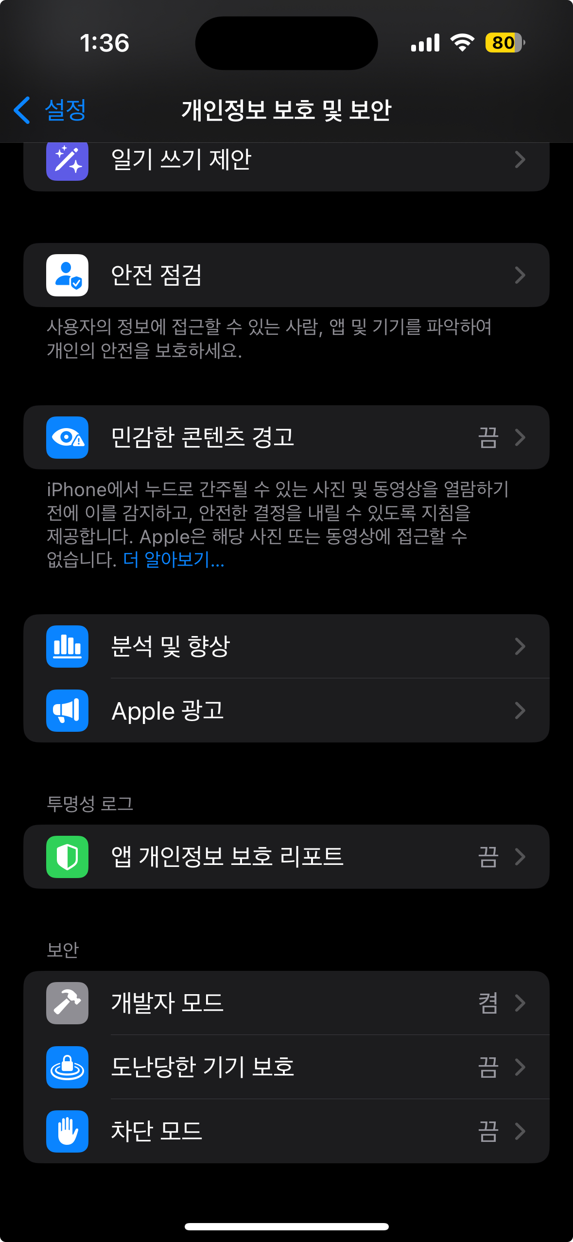 설정 - 개인정보 보호 및 보안에 들어가 개발자 모드 할성화 하면 아래처럼 표시됩니다.